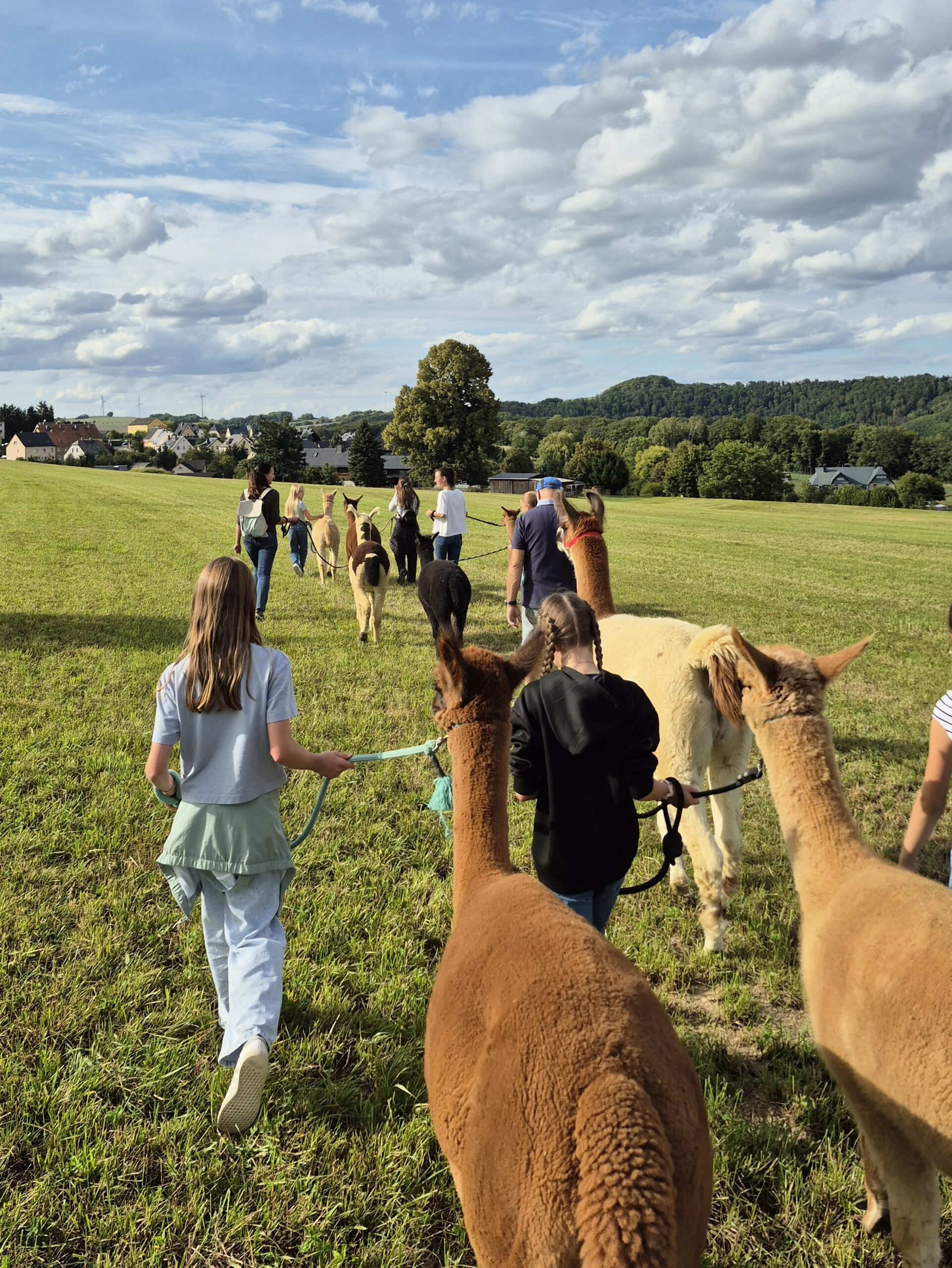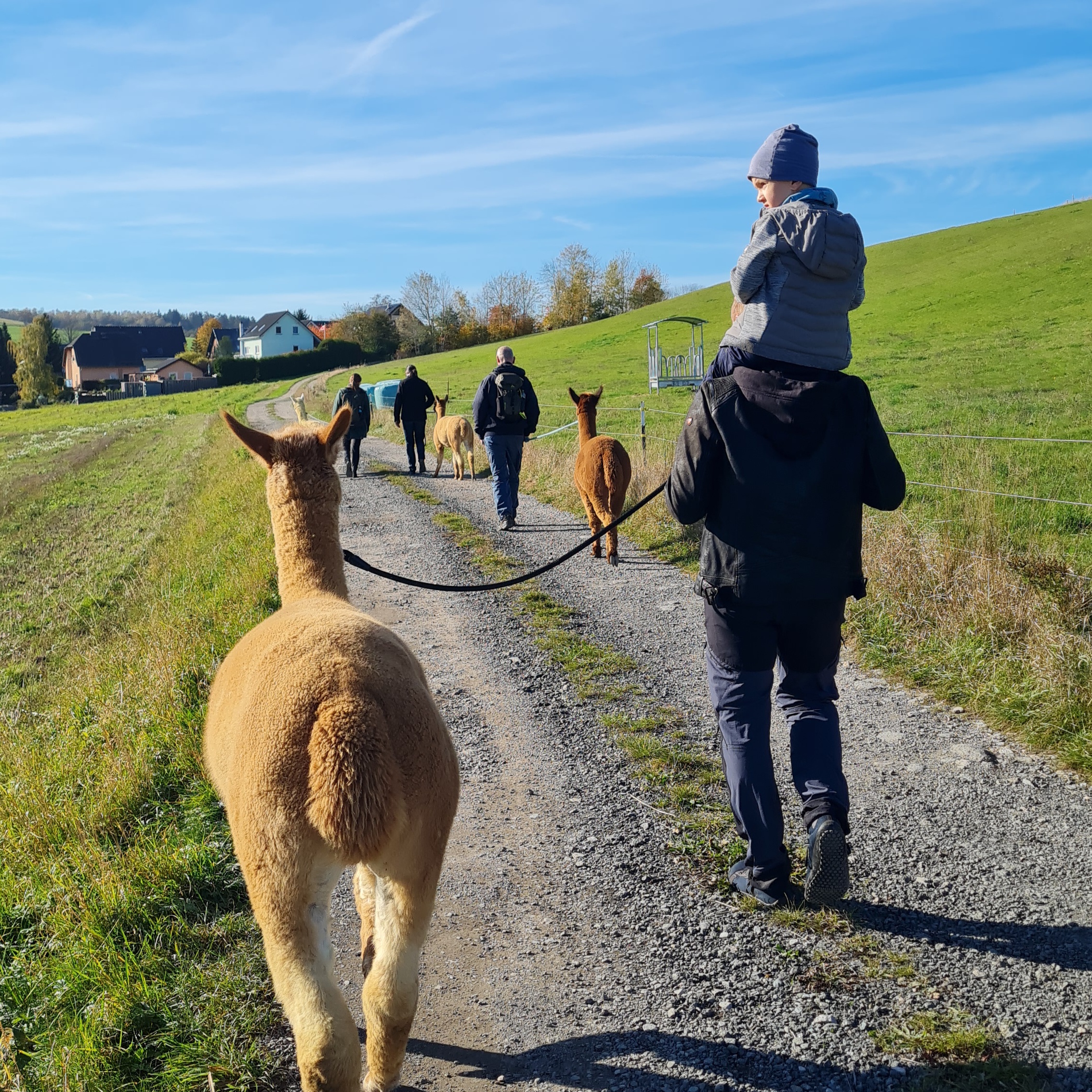 Ideal für alle, die gerne die Seele baumeln lassen wollen. Genießen Sie die Atmosphäre bei einer Wanderung durch Wald und Wiesen mit unseren Tieren. Alpakas sind von Natur aus freundliche und ruhige Wesen, lassen Sie sich von ihren neugierigen Blicken verzaubern und entspannen Sie bei einem Spaziergang durch die Natur.