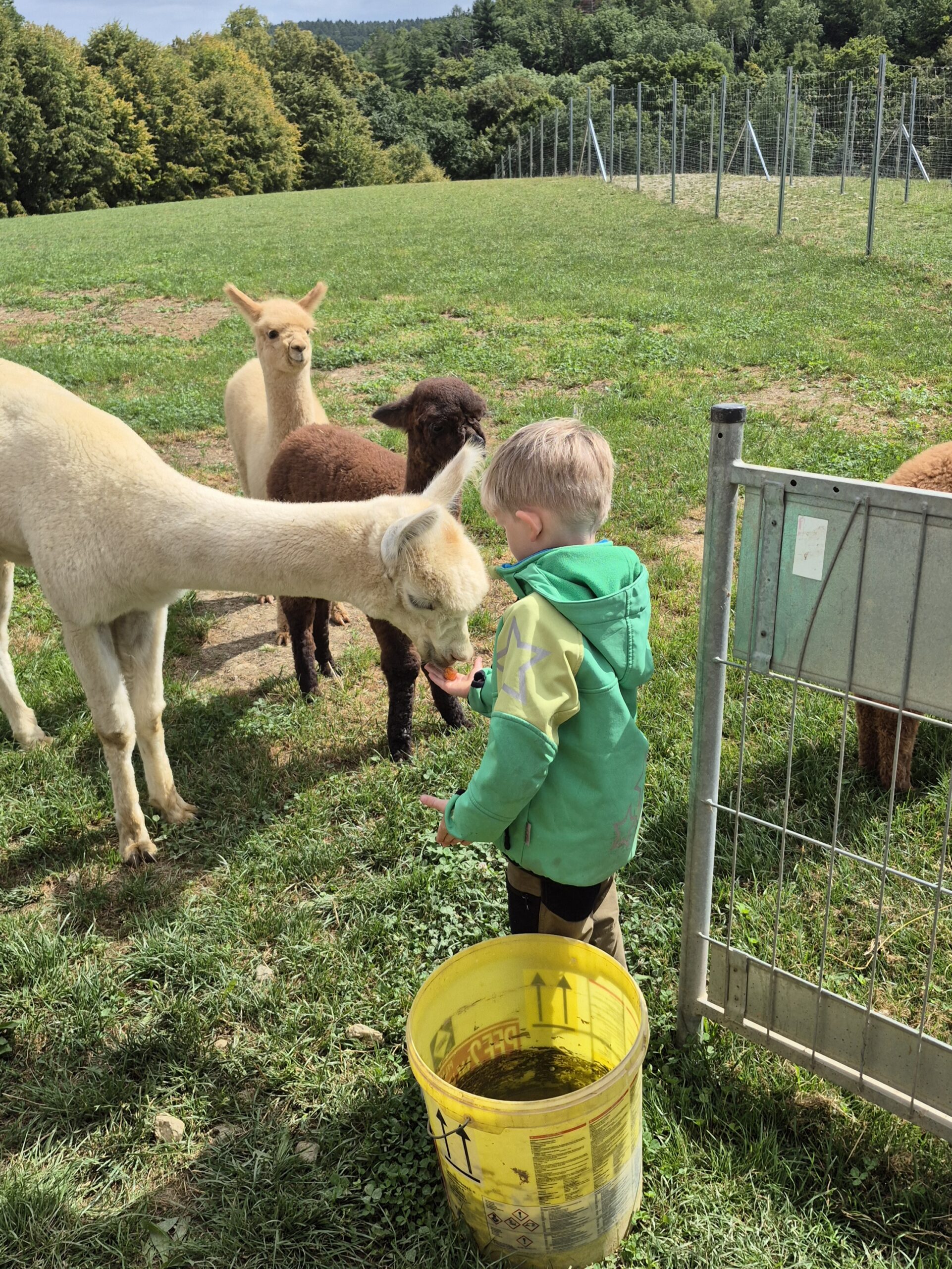 - Gerne können auch geschnittene Möhren oder Äpfel mitgebracht werden. Diese dürft ihr dann an die Alpakas verfüttern.