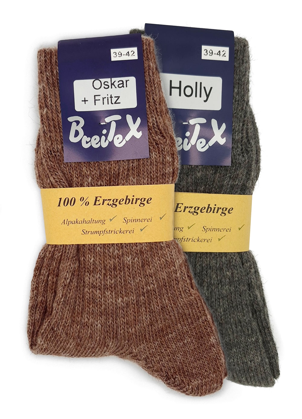 Unsere Socken und Pulswärmer lassen sich den Tieren zuordnen, von dessen Vlies sie kommen. Dementsprechend sind die Farben alle in den natürlichen Vliesfarben der Alpakas. Die Socken bestehen aus einem Wollgemisch mit 50% Alpakawolle – mehr kann man nicht hinzufügen, ohne dass sich der Alpakafaden auflöst und die Socken an der Ferse aufreiben.